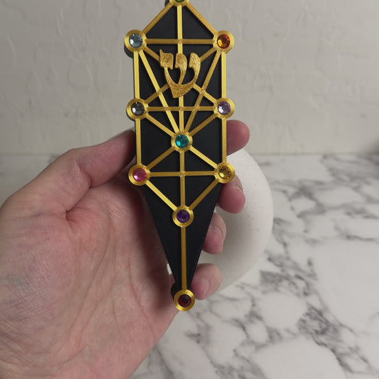 The rhinestones catch and refract light beautifully, creating a subtle rainbow glow that shifts as you pass by—symbolizing the divine light flowing through the Sefirot and into your living space.