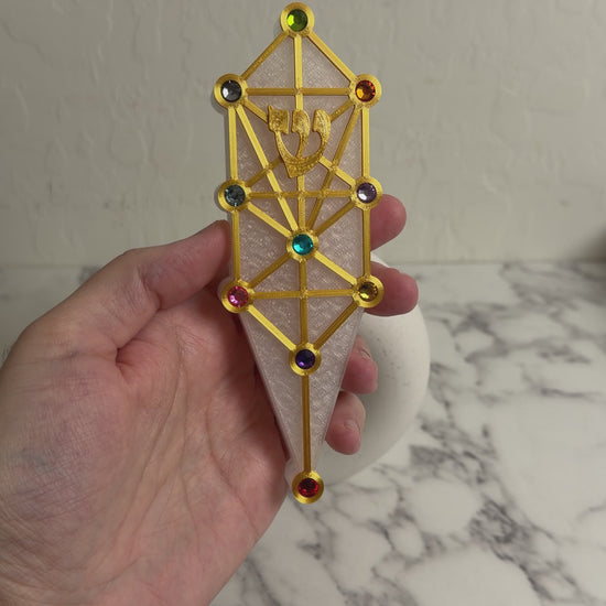 The rhinestones catch and refract light beautifully, creating a subtle rainbow glow that shifts as you pass by—symbolizing the divine light flowing through the Sefirot and into your living space.